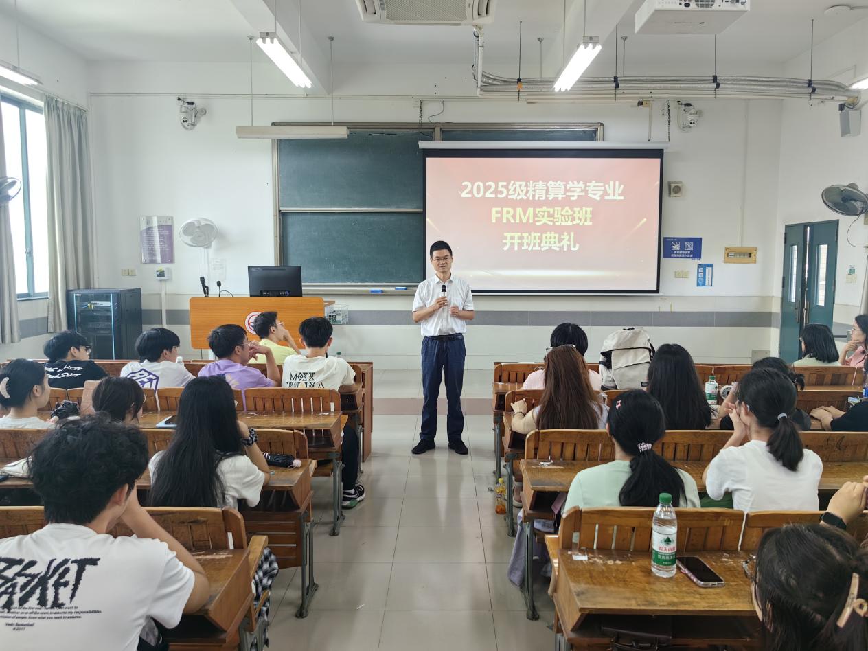 金秋九月,硕果盈枝。9月16日,保险学院2025级金融风险管理师(FRM)实验班开班仪式在北教学楼A501教室顺利举行。保险学院院长陈辉教授、精算科学系主任易沛老师、FRM班教师代表郭方老师以及2025级FRM实验班全体新生齐聚一堂,共同见证这一重要时刻。