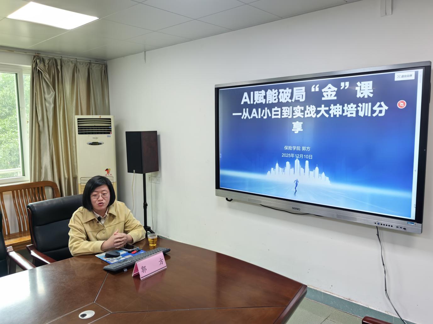 2025年12月10日下午,由保险学院与教师发展中心联合主办的“AI赋能 破局‘金’课——从AI小白到实战大神培训心得分享会”在保险学院会议室顺利举行。教师发展中心肖荣勋副主任应邀出席,保险学院陈辉院长主持活动,特邀赴成都参加AI专题培训的郭方博士担任主讲嘉宾,学院20多位专任教师齐聚一堂,共话AI技术与教育教学的深度融合。