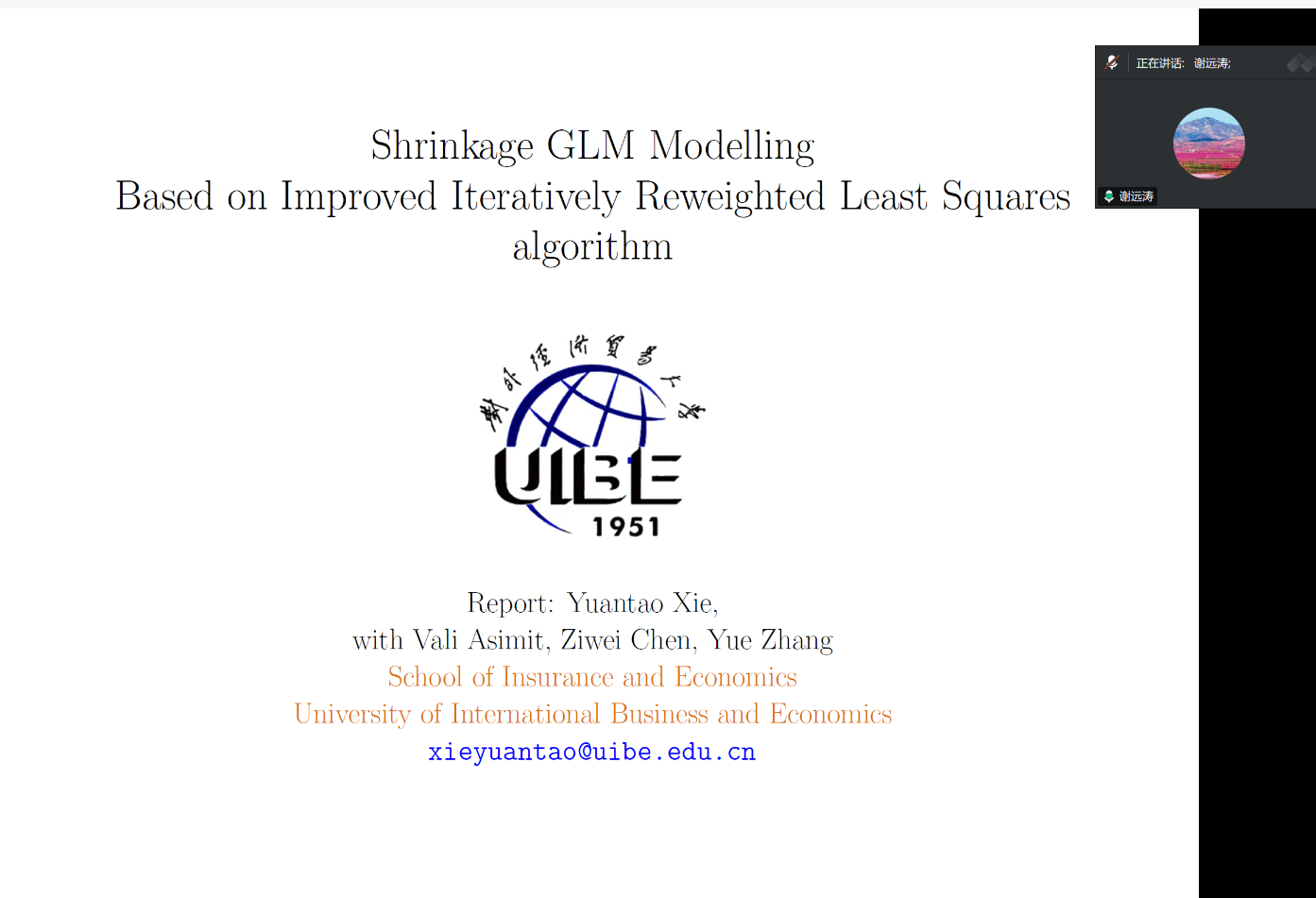 2025年9月24日,广东金融学院保险学院在线上举办了 “广金保险学术讲坛”,邀请到对外经济贸易大学保险学院院长谢远涛教授做学术报告。谢教授为师生带来题为“Shrinkage GLM ModellingBased on Improved Iteratively Reweighted Least Squaresalgorithm”的学术讲座。会议由保险学院院长陈辉主持,保险学院师生、校内外专家学者等共计70余人参加了线上讲座。